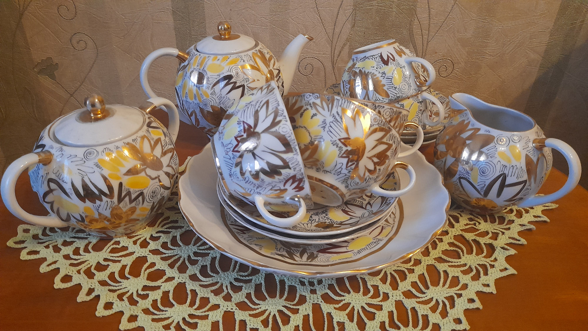 Сервиз, подаренный на серебряную свадьбу, состоял из шести чайных пар, чайника, сахарницы, сливочника и сухарницы. Элементы с ручной росписью и деколью, в основном оформленные золотом, сделали его не только красивым, но и практичным для использования во время семейных праздников. В условиях дефицита, такой фарфор был настоящей роскошью, доступной лишь единицам.