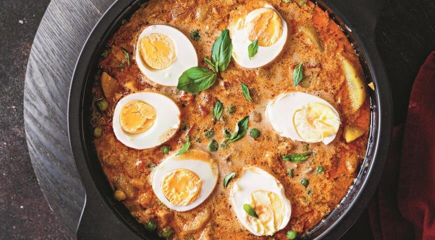 6. Яйца разрежьте на половинки и добавьте в соус, чтобы они прогрелись в течение 2-3 минут. Подавайте к столу горячими, сообщает ГАСТРОНОМ.РУ.