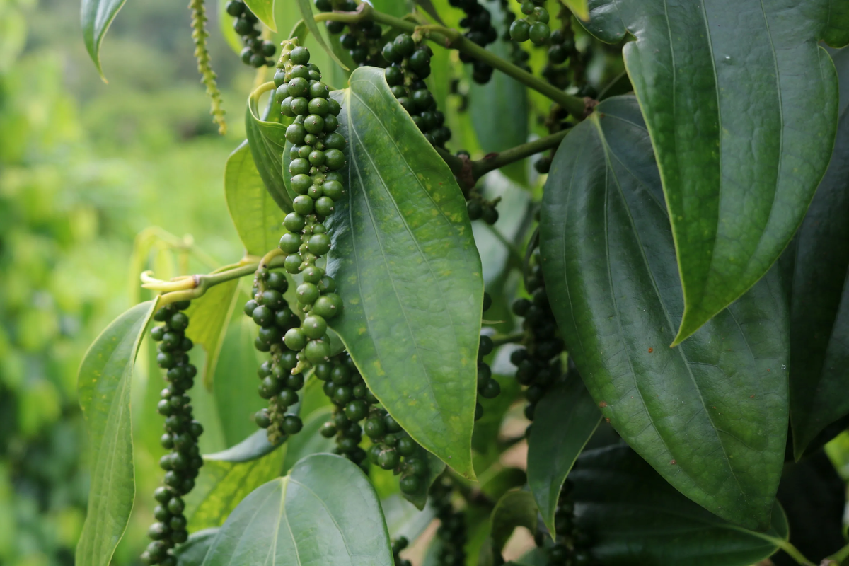 Чёрный перец, популярнейшая пряность, вырастает из лианы. Эта лиана плодоносит ягодами, которые в недозрелом виде используются для производства пряности. При этом, свежие ягодки обдаются кипятком и затем высушиваются. Так получается знакомый всем молотый перец. Интересно, что сроки сбора зависят от вида: зелёный перец обрабатывают диоксидом серы, а белый представляет собой семена уже спелых плодов.
