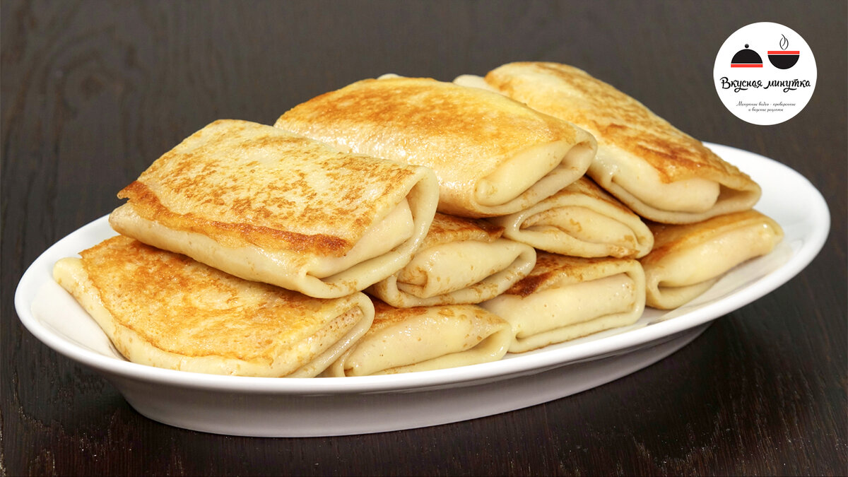 На сковороде следует смазать маслом лишь первый блин. Затем налейте тесто, равномерно распределите его и выпекайте блинчик. Переворачивайте блин и держите с обратной стороны на огне всего 10-15 секунд. Готовые блинчики можно складывать стопкой и накрывать крышкой для сохранения тепла.
