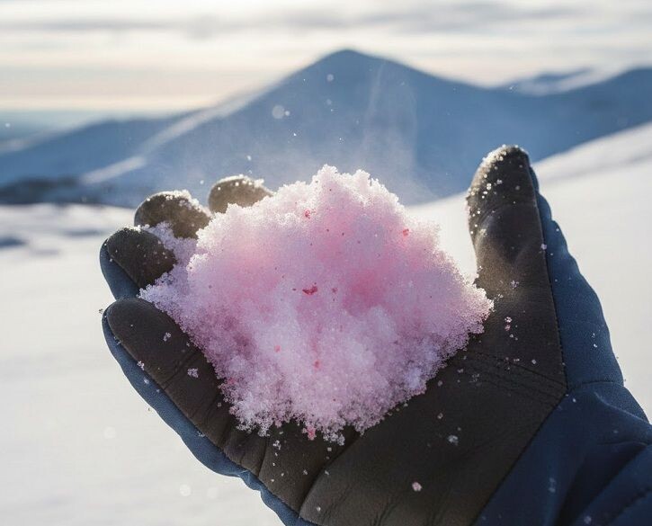 При попадании солнечных лучей снег начинает окрашиваться в нежный розовый цвет, что делает его особенно заметным. За это нестандартное явление отвечает аристократ холодных вод — хламидомонада снежная. Этот микроб содержит пигмент астаксантин, который придаёт розовый цвет не только снегу, но и некоторым морским обитателям, включая лосося.