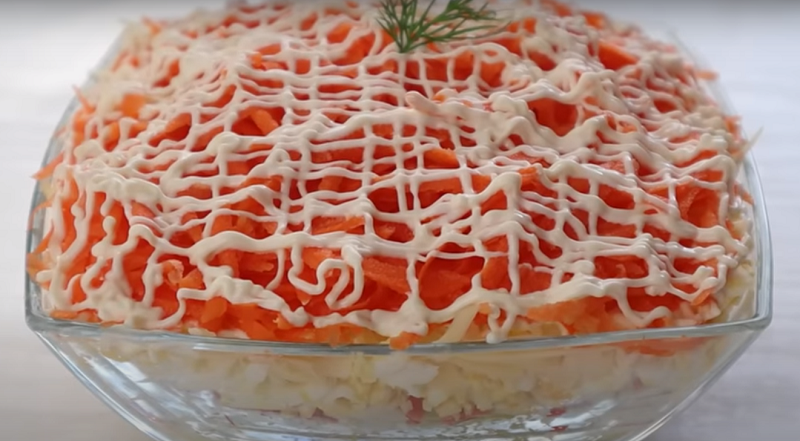 Дайте салату настояться в холодильнике около часа, чтобы он хорошо пропитался. В завершение украсьте его сеточкой из майонеза и свежей зеленью перед подачей к столу.