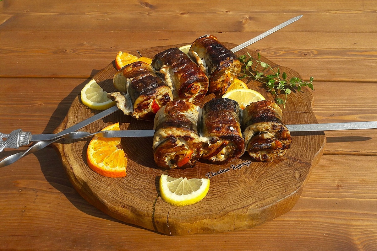 Рулетики нанизываются на шампуры и жарятся на мангале. Важно постоянно поворачивать их, чтобы добиться аппетитной золотистой корочки.