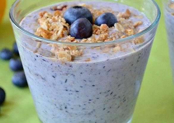 - Шаг 4: Выложить готовую овсянку в стаканы, украсив сверху ломтиками банана и ягодами черники.