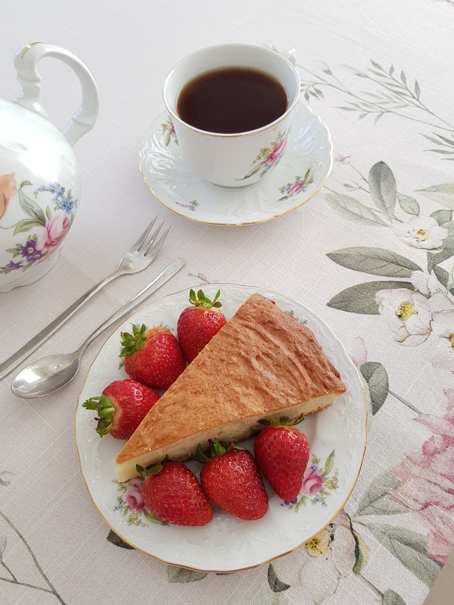 6. Нарезать пирог на порции и подавать с сочной клубникой. Приятного аппетита!