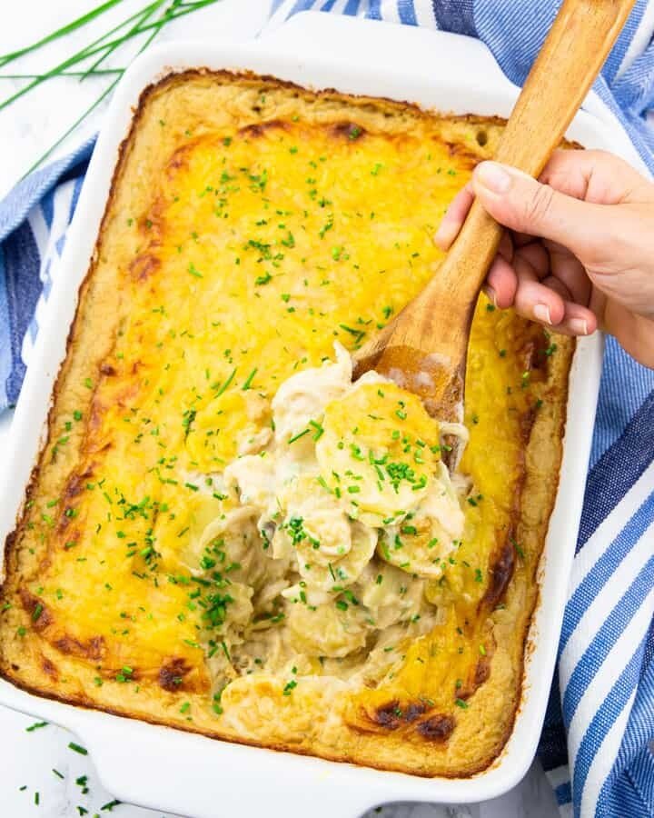 3. На дно формы выложите половину ломтиков картофеля и полейте их половиной приготовленного соуса.