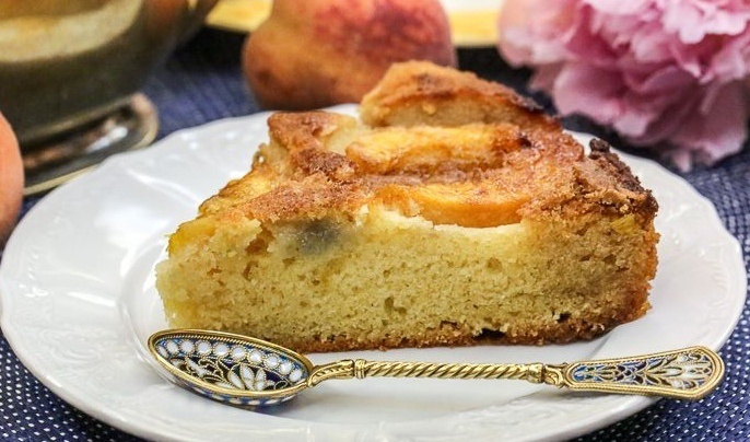 Пеките пирог в разогретой до 190°C духовке около 50 минут. Если верх начнет подгорать, накройте его пергаментом. Проверяйте готовность с помощью деревянной зубочистки — если она выходит сухой, значит, пирог готов. Оставьте его остывать, затем аккуратно переверните на тарелку, чтобы персики оказались сверху. Разрежьте на порции и подавайте к столу!