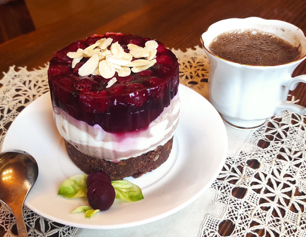 Когда заливка застынет, аккуратно извлечь чизкейки из форм. Украсить назначенными орехами, вишней и листиками мяты. Этот десерт удивляет контрастом сладких и кислых вкусов, что делает его по-настоящему уникальным.