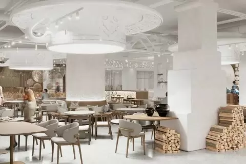Эскизы фуд-корта подчеркивают стремление создать уникальное пространство, которое будет не только эстетически привлекательным, но и предлагаемым для наслаждения традиционной татарской кухней. Вдалеке, архитектурные элементы и кулинарные шедевры обещают стать изюминкой нового казанского ЦУМа.