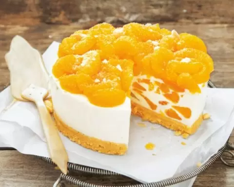 Когда основа торта уже охладилась, равномерно выложите крем, украсьте дольками мандаринов и снова уберите в холодильник на 4-6 часов. После этого торт готов к подаче — чудесное сочетание текстур и вкусов сделает его настоящим сердцем любого торжества.