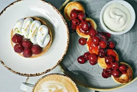 Готовые сырники подаются на тарелке, щедро политы подготовленным вишневым вареньем, а рядом можно разместить сметану для полного наслаждения блюдом.