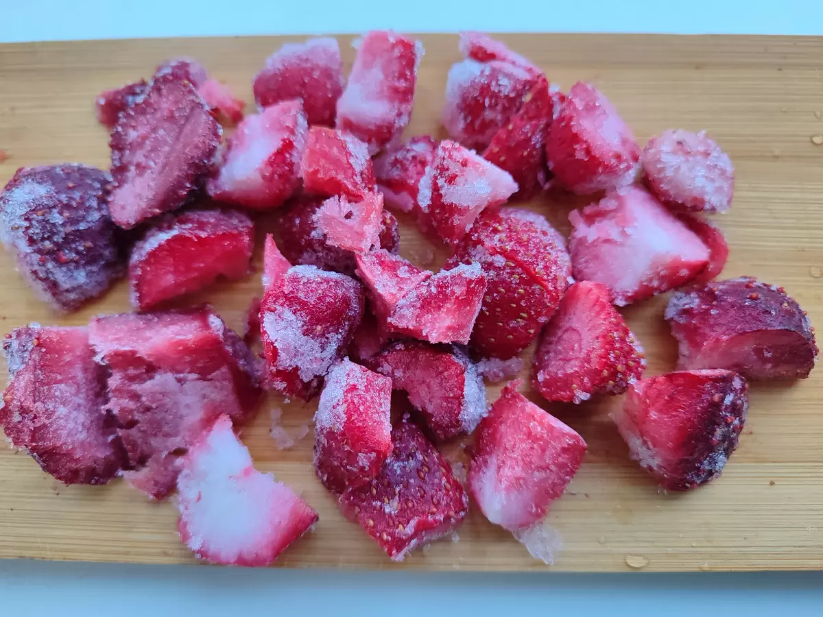 Ингредиенты: 100 г замороженных ягод (по выбору), 1-2 печенья или сухариков, мед по вкусу, 100 г растительного молока, 100 мл воды.