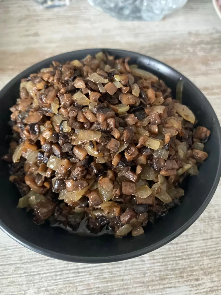 Создавая жюльен, сначала были обжарены шампиньоны с луком, затем на сковороде был добавлен копчёный бекон. Все ингредиенты тщательно смешивались, а в финале к ним была добавлена сметана и щепотка молотого перца.