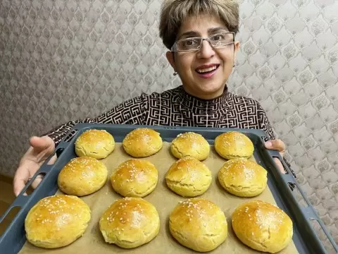 Теперь разделите тесто на небольшие порции и сделайте из них круглые лепешки. На каждую лепешку положите шарик начинки и аккуратно защипните, придавая булочкам форму. Смажьте поверхность желтком и присыпьте кунжутом. Поместите булочки на противень и отправьте в предварительно разогретую до 180 градусов духовку на 25 минут.