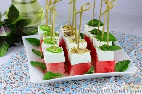 - Канапе из арбуза с фетой — необычное сочетание сладкого арбуза с солоноватым сыром. Такое канапе отлично смотрится на столе и предоставляет возможность насладиться оттенками вкусов. Для украшения можно использовать зелень, орехи и оливковое масло.