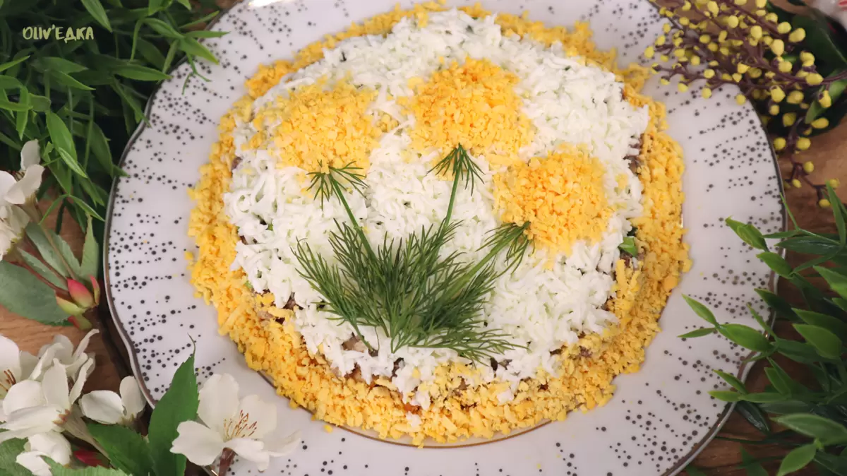 Следующий слой — нарезанный зеленый лук (вместо него можно взять репчатый). Потом натертые яичные белки. Яичные желтки натираются на мелкой терке и выкладываются тремя горками в виде одуванчиков, обрамленными желтками. Дополнять оформление можно веточками укропа, чтобы подчеркнуть весеннее настроение.