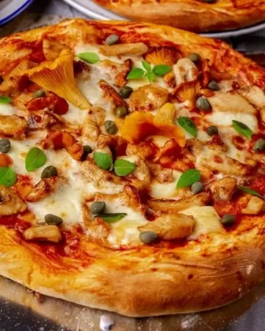 Разогреть духовку до 250 °C. Для выпекания лучше использовать специальный камень. Раскатать шарики теста в круглые лепешки ручным методом, оставляя бортик. На подготовленную основу выложить соус, сыр, обжаренную курицу, лисички и немного сыра сверху. Посыпать каперсами и отправить в духовку на 8 минут до появления золотистой корочки. Перед подачей посыпать свежим базиликом.
