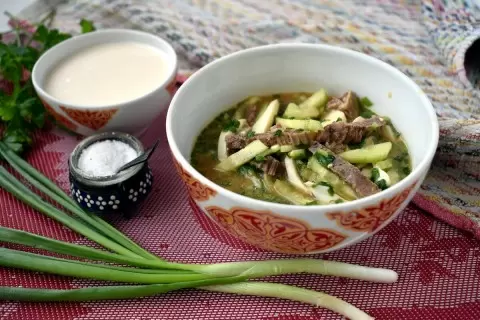 Зеленый лук тщательно промывают, а затем мелко нарезают и растирают с солью в кастрюле. После этого в смесь добавляют яичные белки, желтки с горчицей, огурцы и говядину. Вливая квас, все компоненты тщательно перемешиваются и отправляются в холодильник на полчаса.