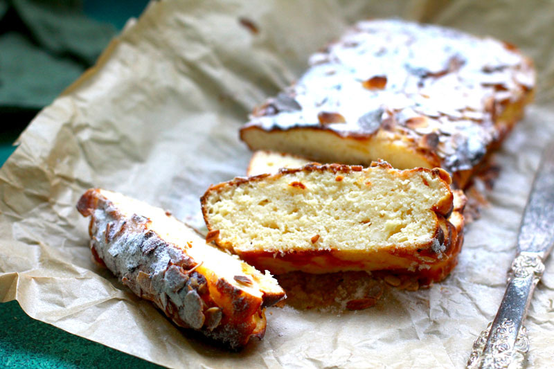 Форму для кекса размером 20х10 см следует застелить пергаментом и выложить тесто. Разровнять поверхность мокрой лопаткой и посыпать миндальными лепестками, если хотите, можно добавить замороженные ягоды, например, бруснику. Запекать при температуре 180 градусов в течение 20-30 минут, ориентируясь на желаемую степень румяности верхней корочки.