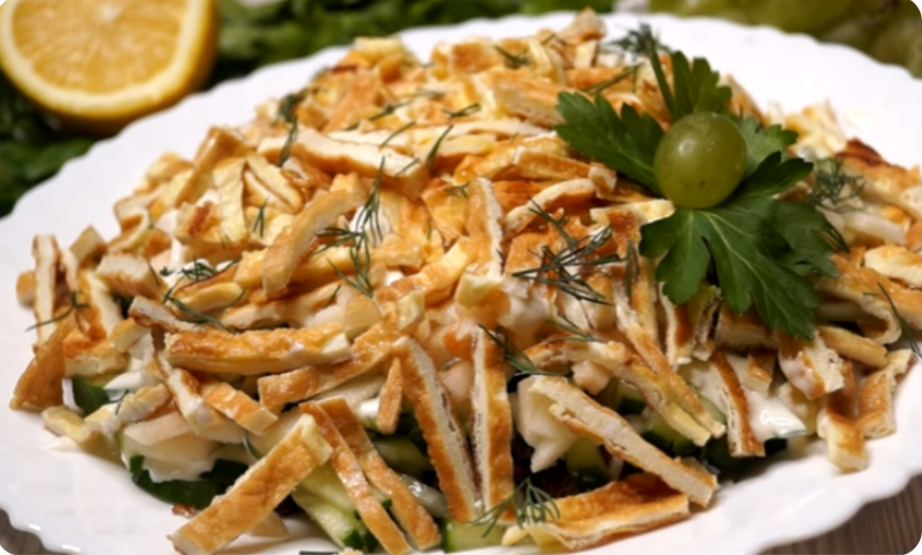 Создание восхитительного салата не всегда требует редких ингредиентов и сложных техник. Этот простой рецепт с легкостью это подтверждает. Он основан на доступных продуктах, которые в сочетании дарят удивительный результат: салат получается не только сытным, но и освежающим. Уникальная идея заменить вареные яйца яичным блинчиком в виде соломки вносит интересный акцент. Такое блюдо идеально подойдет для уютного семейного ужина или же для неожиданных встреч с друзьями.