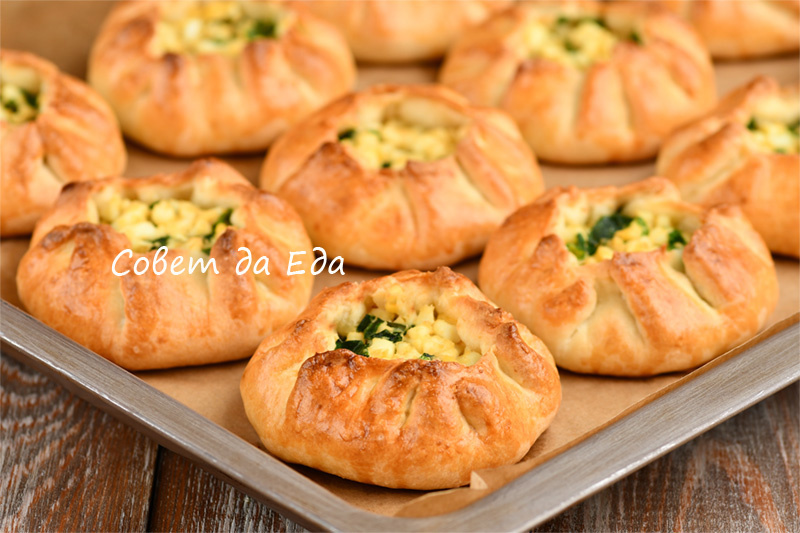 Для начала кипятим яйца, а затем обжариваем мелко нарезанный зеленый лук на растительном масле. В миске смешиваем муку, разрыхлитель, сахар и соль, добавляем растопленное масло, сметану и одно яйцо. Замешиваем тесто и оставляем его в холодильнике на 20 минут. Затем формируем пирожки с начинкой из жареного лука и нарезанных яиц, смазываем их оставшимся яйцом и выпекаем при 180 °C около 20 минут. Пирожки получаются румяными и ароматными, пишет источник.