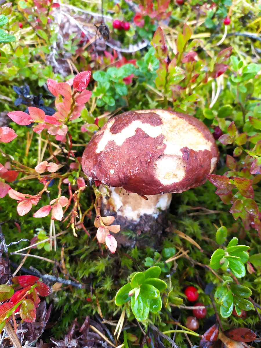 - Белые грибы хитро замаскированы в брусничных зарослях, создавая впечатление, что они сливаются с лесным ландшафтом.