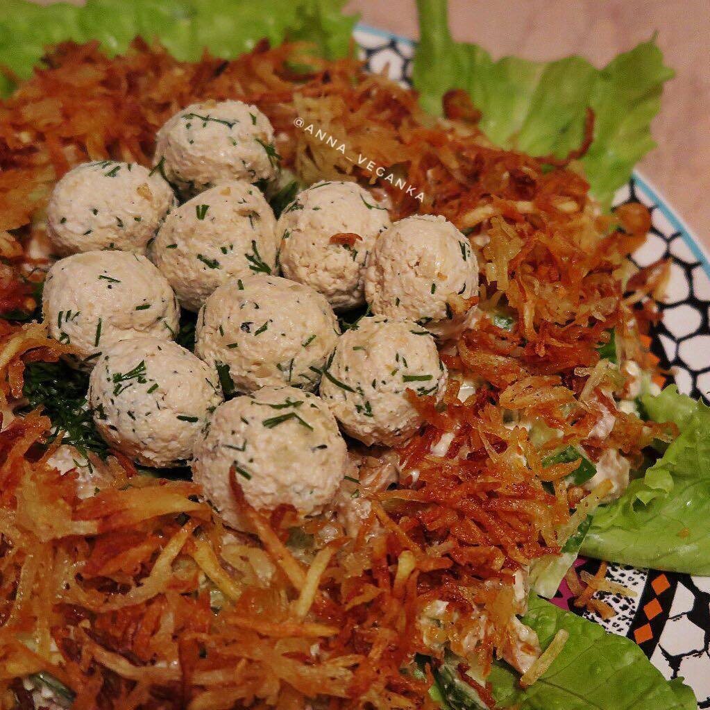 Знаменитый салат «Гнездо глухаря» обычно включает в себя мясные ингредиенты и яйца, однако его можно легко преобразовать в полноценный веганский вариант, не теряя при этом ни сытности, ни привлекательности. Эта адаптация подойдет как для повседневных, так и для праздничных мероприятий.