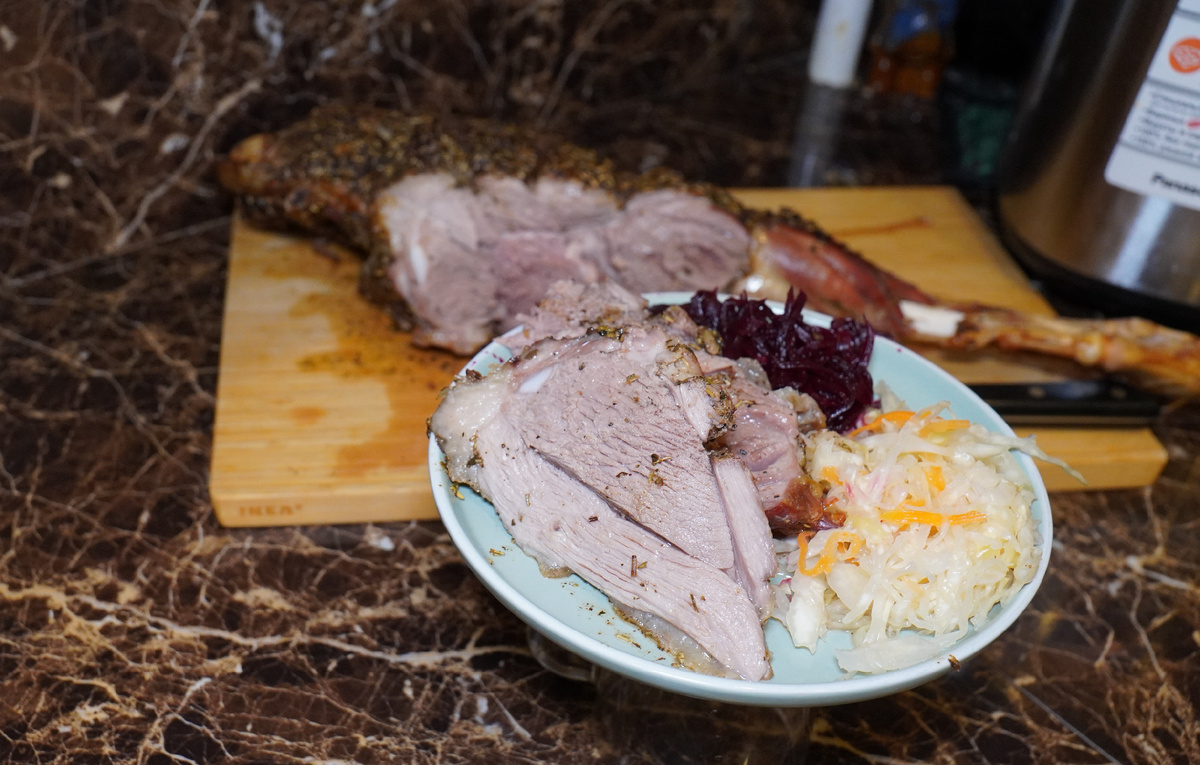 3. Запекание: В самую толстую часть ноги вставить термометр и запекать в предварительно разогретой до 180°C духовке в течение 2-2,5 часов. Когда внутреннее давление мяса достигнет 60°C, развернуть фольгу и оставить еще на 20 минут, чтобы образовалась румяная корочка. В финале температура должна достигнуть около 70°C.