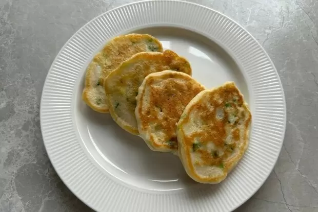 Постепенно вводить муку и соду, добиваясь однородного теста. После этого нужно отварить два яйца, нарезать их кубиками и добавить к тесту вместе с мелко порезанным зеленым луком. Все ингредиенты снова соединить и перемешать до получения однородной массы.