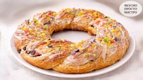 Для глазури взбейте 60 г маскарпоне с 25 г сахарной пудры. Обильно смажьте глазурью остывший венок и украсьте разноцветными цукатами. Такой венок станет изюминкой любого стола на Пасху, собрав вокруг себя радость и теплоту семьи.