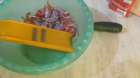 После этого можно переходить к подготовке овощей. Следует нарезать болгарский перец и красный лук мелкими кубиками, а морковь и огурец натереть на мелкой терке. Чтобы морковь стала более мягкой, её можно слегка сжать руками в течение нескольких минут.