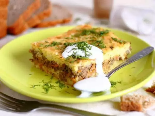 Картофель также отваривается до готовности, затем размять в пюре с добавлением масла, соли и яиц. В форме для запекания укладываются слои: сначала немного пюре, затем печеночная начинка, и снова пюре. Верх запеканки покрывается сметаной для румяной корочки.