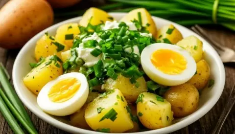 Приготовление: отварить картофель в мундирах, остудить и нарезать. Яйца отварить, нарезать. Черемшу и зеленый лук промыть и нарезать. Все ingredients смешать, заправить сметаной, добавить специи и по желанию — горчицу или соленую рыбу.