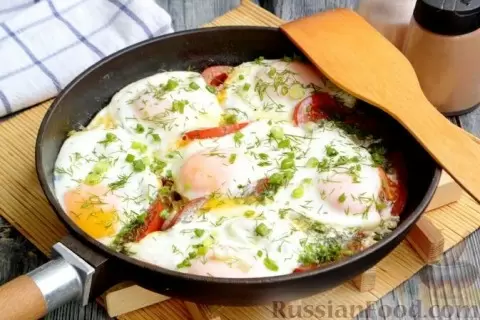 - Ингредиенты: яйца, стручковая фасоль, помидоры, зелёный лук, растительное масло.