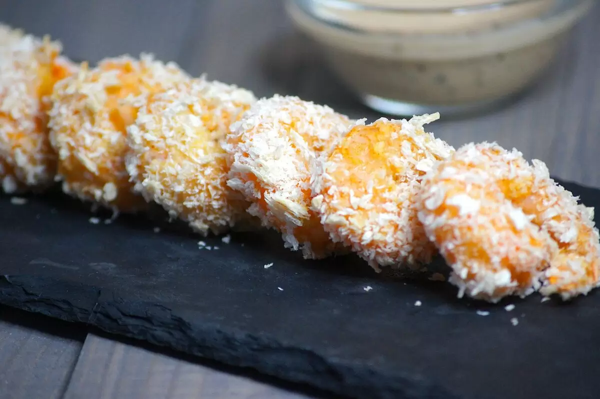 Далее в небольшой миске вбиваются яйца и тщательно перемешиваются, после чего каждая креветка обмакивается в яичной смеси и обваливается в панировочных хлопьях. Этот этап – ключ к получению идеальной хрустящей корочки. На противень, предварительно застеленный пергаментом, выкладываются панированные креветки. Важно, чтобы духовка была заранее разогрета до 200 градусов, и только после этого блюда помещаются в нее на 20 минут.