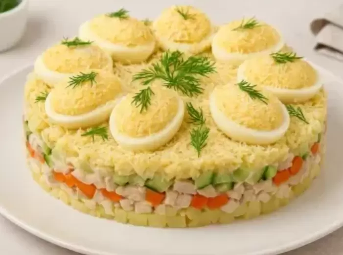 Шаг 3: Соберите салат слоями. Начните с картофеля, слегка присолите и добавьте перец, затем покройте майонезом. Следующим слоем положите куриное мясо с майонезом, затем морковь и огурец. Каждый слой стоит аккуратно прижимать ложкой, чтобы салат держал форму. Завершите процесс, выложив фаршированные яйца начинкой вниз, и покройте их майонезом, посыпав сверху натёртым сыром и украсив укропом.