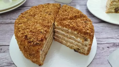 Сборка торта: На подложку выложить корж и смазать кремом, добавляя по желанию орехи или чернослив. Обмазать торт кремом и обсыпать крошкой. Убрать в холодильник на ночь для пропитывания.