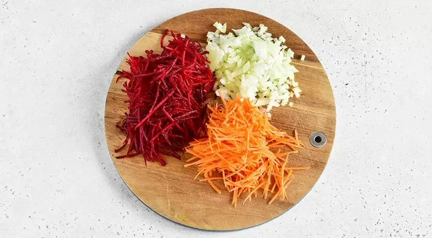 Начинать следует с подготовки овощей: лук нарезать мелкими кубиками, а морковь и свеклу натереть на крупной терке. Сладкий перец освободить от семян и нарезать полосками, капусту нашинковать, а картофель нарезать кубиками.