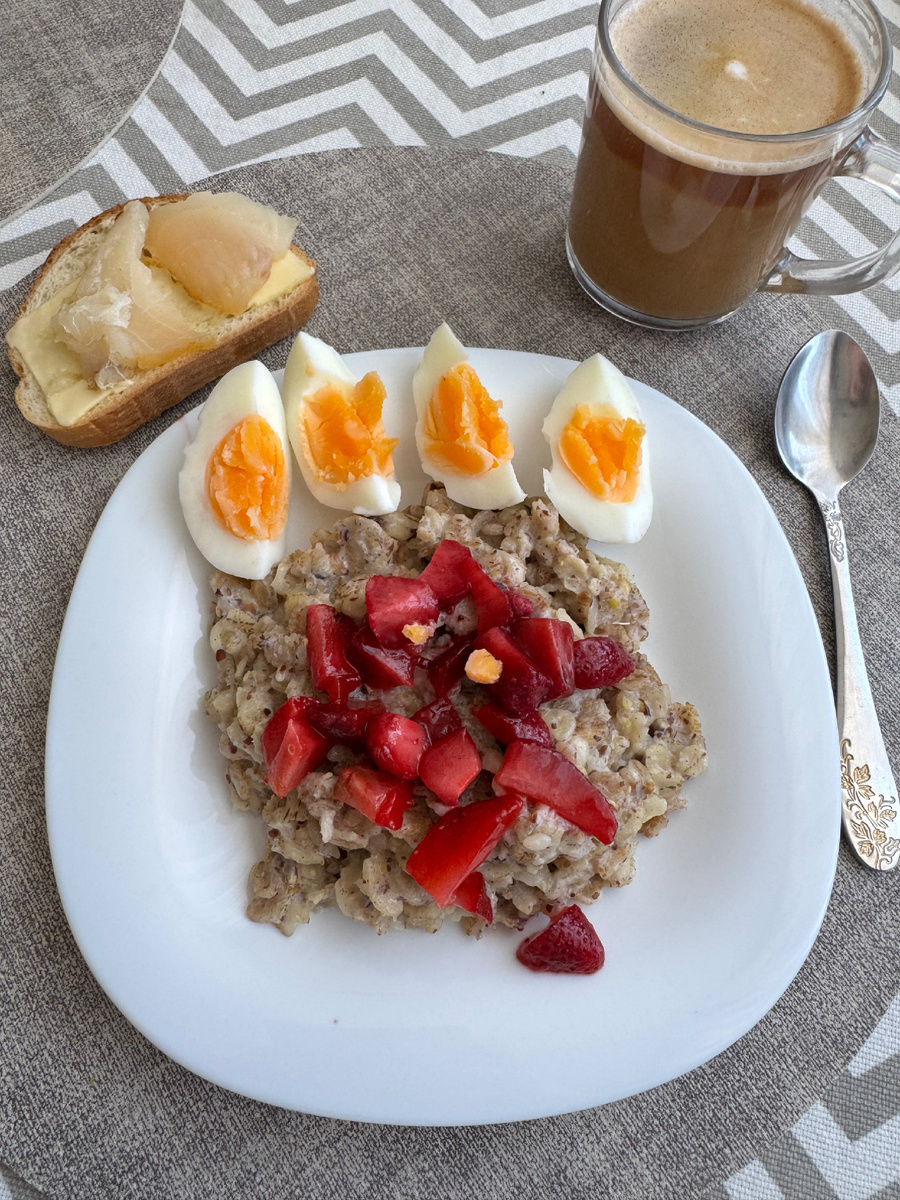 - Творог с фруктами и орехами: натуральный творог, любые ягоды или фрукты и небольшая порция орехов — отличный способ начать день, насыщая организм белками и клетчаткой.