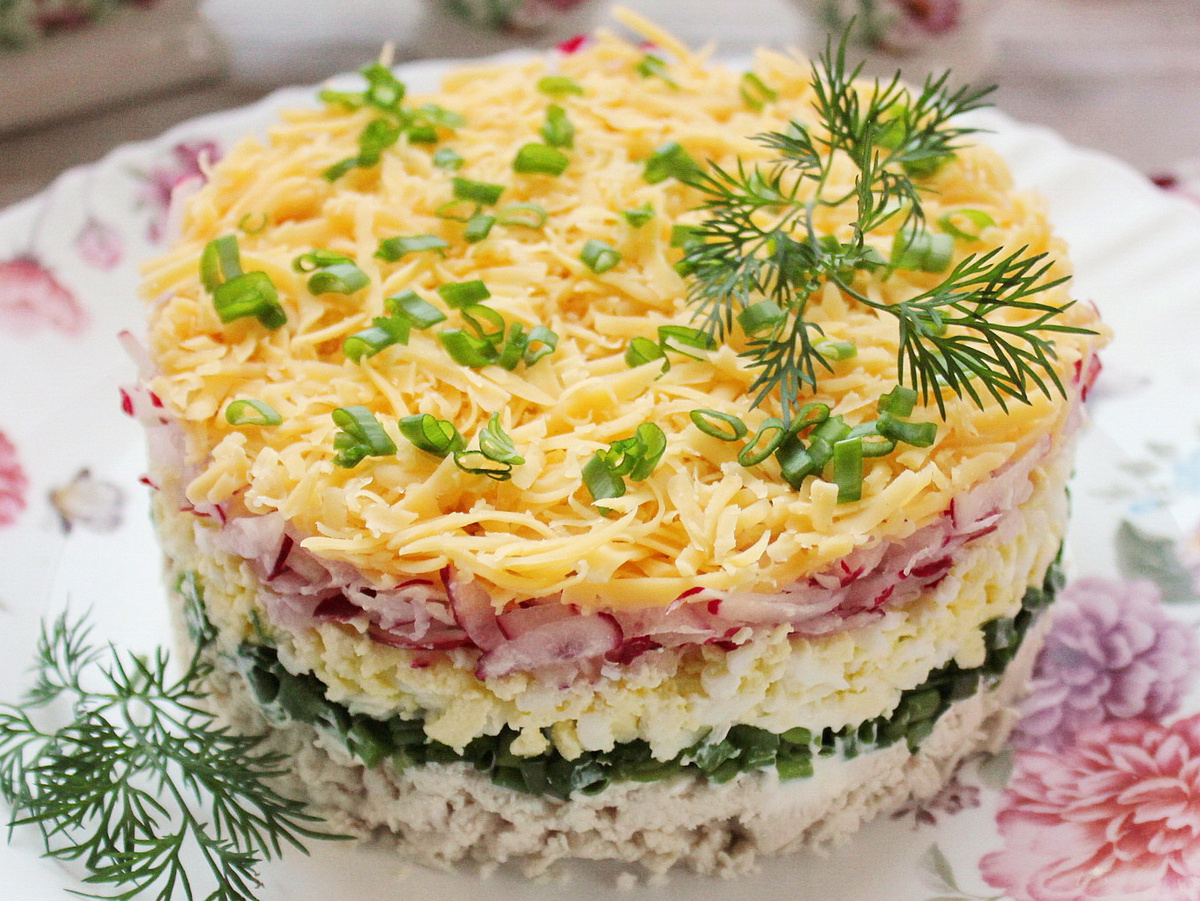 Следом идет мелко нарезанный зеленый лук, который придаёт свежесть и аромат, а затем тщательно натертые варёные яйца — они добавляют нежности и мягкости. Редиска, натертая на крупной терке, становится седьмым слоем и должна укладываться без соли, чтобы сохранить свою влагу и текстуру. Завершающий штрих — 50 г тертого сыра, который равномерно посыпается сверху. Он придаёт финальный акцент, создавая красивую корочку.