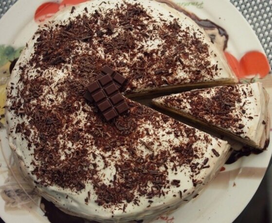 Соберите торт, пропитав коржи кремом, и не забудьте украсить его натертым шоколадом. Для наилучшего результата, поставьте торт в холодильник на два часа, чтобы он хорошо пропитался и стал еще более вкусным.
