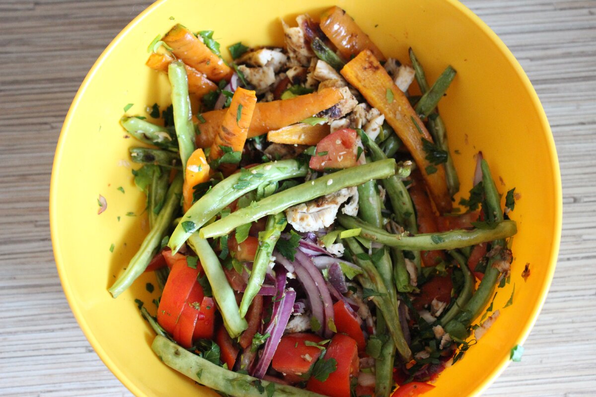 Куриную грудку приправить солью, перцем и орегано, сбрызнуть оливковым маслом и обжарить на гриле до готовности.На том же гриле подготовить стручковую фасоль и нарезанную вдоль морковь.Готовую курицу нарезать небольшими кусочками.Зелень мелко порубить, красный лук нарезать полукольцами, а помидоры — кубиками.Все ингредиенты сложить в одну большую миску.Заправку приготовить, смешав 3 столовые ложки оливкового масла, горчицу и лимонный сок.Заправить салат и тщательно перемешать. Блюдо готово к подаче!